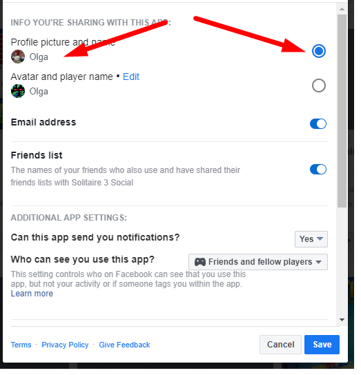 Вы можете переключить свой профиль в настройках игры по ссылке: https://www.facebook.com/games/manage